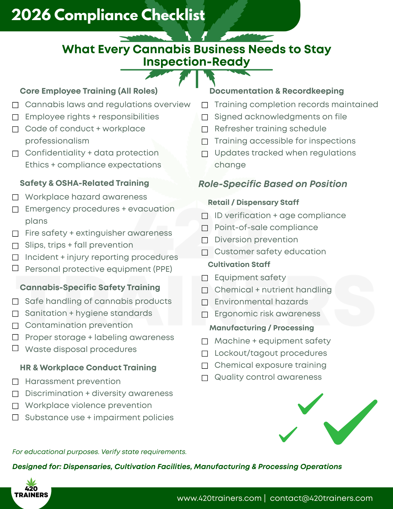The 2026 Cannabis Compliance Checklist (download available below) outlines the essential training, safety, and documentation requirements cannabis businesses need to meet regulatory expectations across dispensary, cultivation, and manufacturing operations.